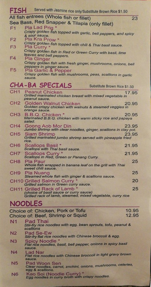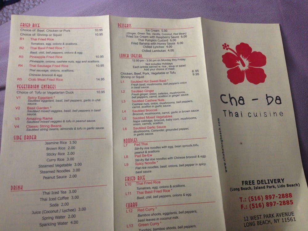 Welcome to Cha Ba Thai, a delightful gem located at 12 W Park Ave, Long Beach. This Thai cuisine hotspot combines a cozy, casual ambiance with an extensive menu that caters to both meat lovers and vegetarians. Well-known for its vibrant and fresh dishes, Cha Ba Thai offers enticing options such as the Spicy Eggplant and Pad Thai, both garnished to perfection.